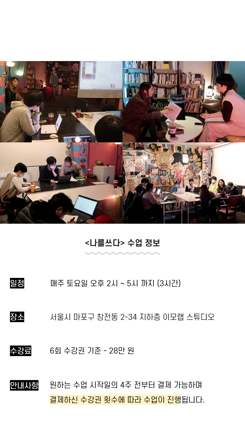 장소 : 이모랩 (서울 마포구 창전동 2-34 지층)